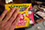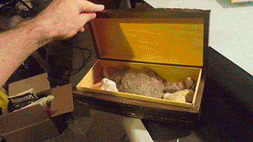 A small light sensor is hidden within this box of rocks. When the box is open the visuals change and move, but when the box is closed the light sensor acts as a pause button and holds the visuals in place