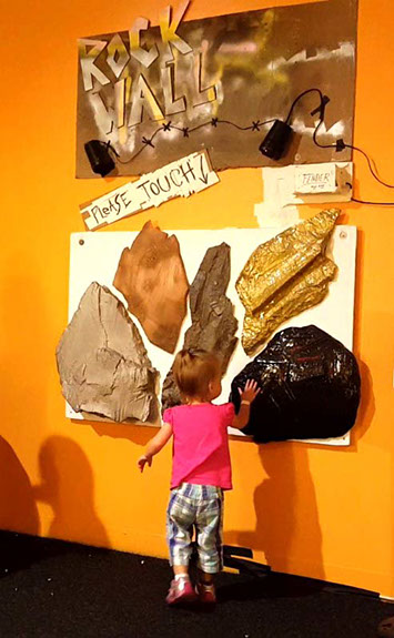 ROcK Wall! Rock Wall is a touch reactive wall of interactive rock sculptures. Touching a rock will trigger one of many rock-and-roll music stings. Each type of rock has it's own unique texture and will trigger it's own type of instrument. Rock Wall was developed as a prototype for interactive art that focuses on the idea of Universal Design, meaning that anyone, regardless of age, height, gender, ability or disability would be able to have a meaningful interaction. To do so, multiple human senses are addressed through sight, touch, sound, texture, and more.
