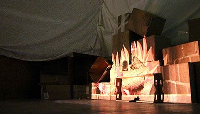 The Digital Lounge will be an area of rest and soothing interactions. One might sit on a rocking chair that will play soothing music and soundscapes triggered by their rocking, or perhaps you'd like to sit on a bean bag chair by the projection mapped cardboard fire place. There will even be a romantic porch swing projecting a nighttime skyline with an Aurora Borealis Northern Lights show responsive to the subtle motion of the swing.